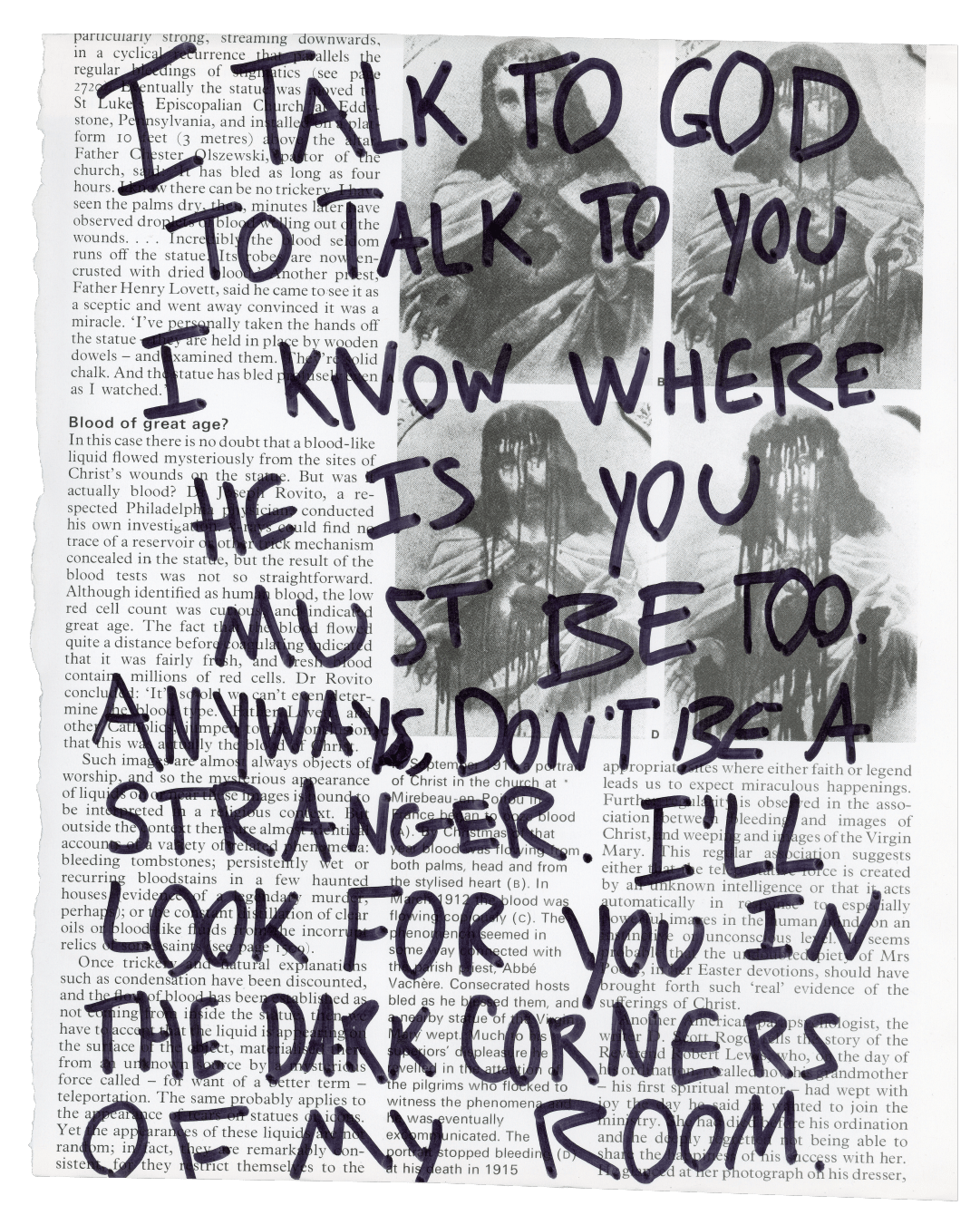 I TALK TO GOD TO TALK TO YOU I KNOW WHERE HE IS YOU MUST BE TOO. ANYWAYS, DON'T BE A STRANGER. I'LL LOOK FOR YOU IN THE DARK CORNERS OF MY ROOM.